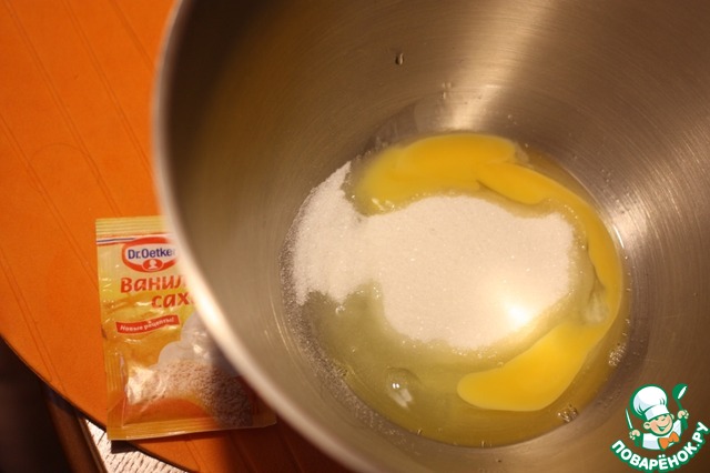 Яйца взбить с сахаром ( и про ванильный не забываем), но без фанатизма. До лёгкой пены.