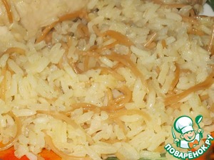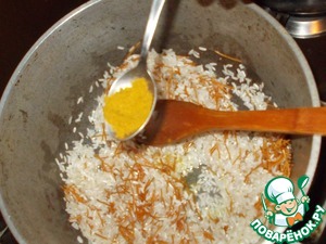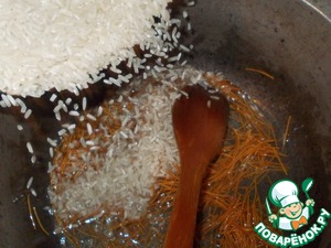 Быстро ее перемешивая, поджариваем до золотисто-коричневого цвета. Затем всыпаем просушенный рис к поджаренной вермишели.