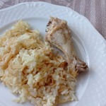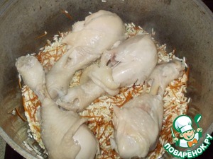 После того, как рис побелел, выкладываем в казан проваренные голени.