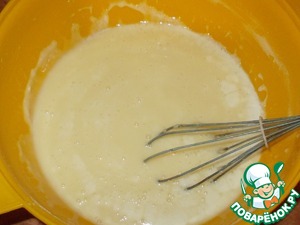 В миску вливаем рассол, растительное масло, вбиваем яйца, всыпаем сахар, соль, 1 ст. просеянной муки и соду погашенную уксусом.