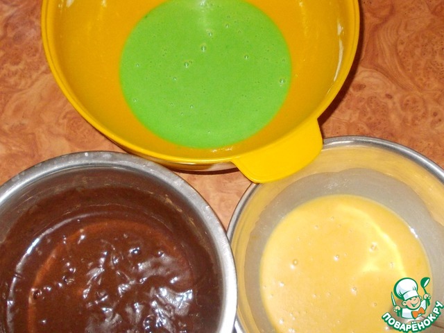 Тщательно размешиваем содержимое трех мисок. Получаем жидкое составляющее трех цветов.