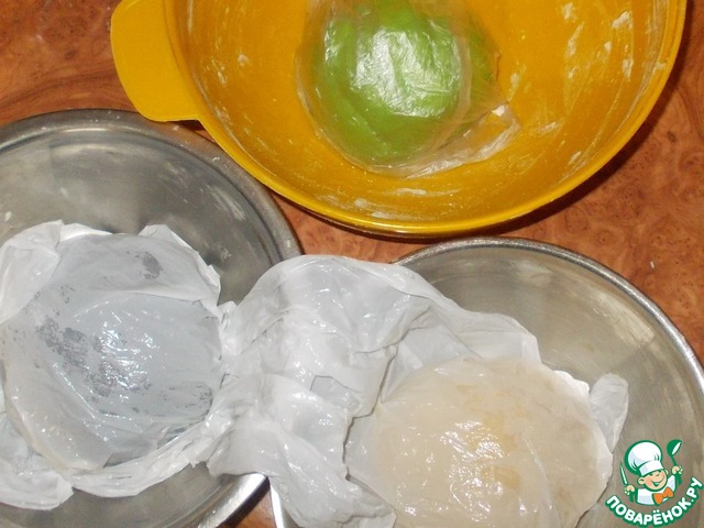 Теперь в каждую из мисок всыпаем по 1,5 ст просеянной муки и замешиваем тесто трех цветов. Зеленое мне нравится очень!