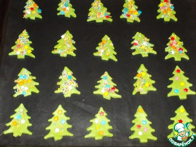 Берем одну из елочек и кладем на присыпку. Не слишком сильно придавливаем, что украшения прилипли. И выкладываем на противень. Застеленный бумагой или ковриком для выпечки.