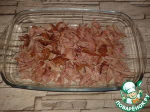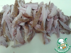 Копченые бедра очистить от кожи и костей и нарезать соломкой. Я кожу снимала не всю-местами плохо отходила, поэтому резала вместе с ней