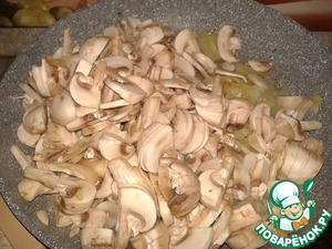 К луку добавить грибы и жарить до готовности. Сок от грибов должен испариться. Готовить на сильном огне и периодически помешивать, чтобы лук с грибами не пригорели