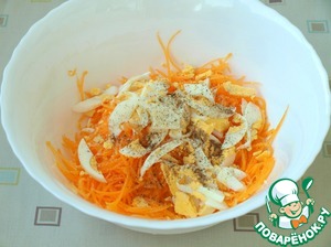 Яйца сварить вкрутую, нарезать соломкой и добавить к тыкве, посолить и поперчить.