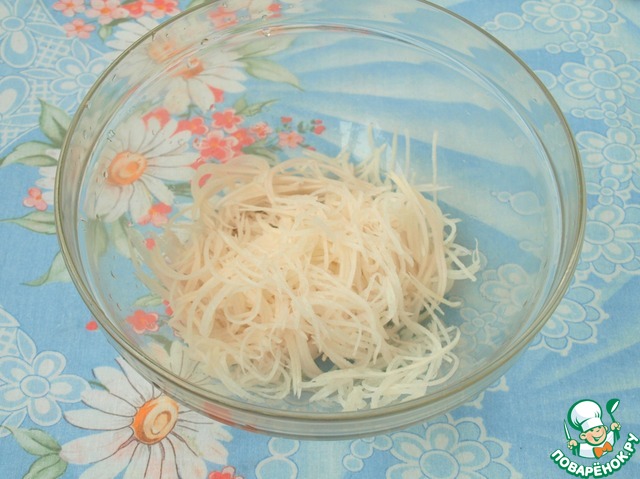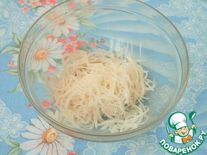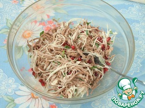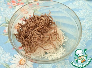 • Отварную говядину разобрать на волокна и добавить к дайкону.