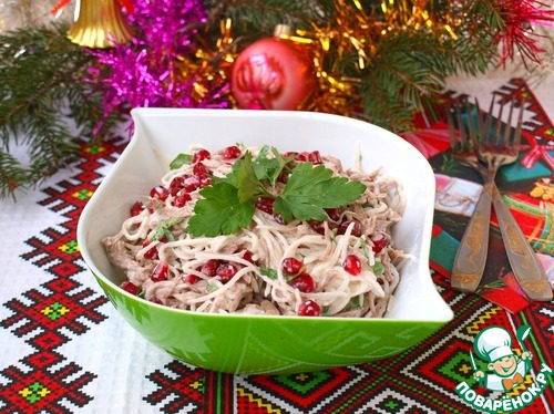 Ещё один мясной салат, который может разнообразить ваше меню на праздники. Очень сытный и вкусный.