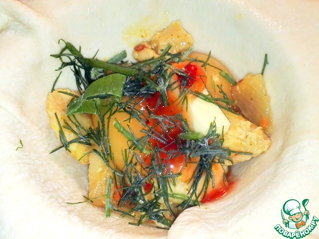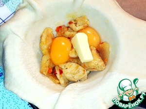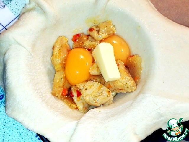 Рецепт «Мешочек с курицей и перепелиным яйцом»: