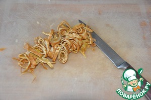 Остывшие блинчики сворачиваем в трубочку, тонко режем.