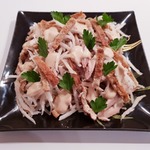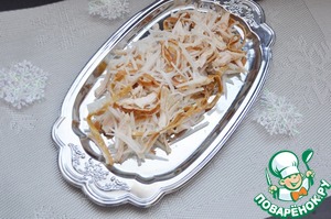 Берём редьку (дайкон) и натираем тонкими полосками. Посыпаем солью, сбрызгиваем уксусом, перемешиваем.