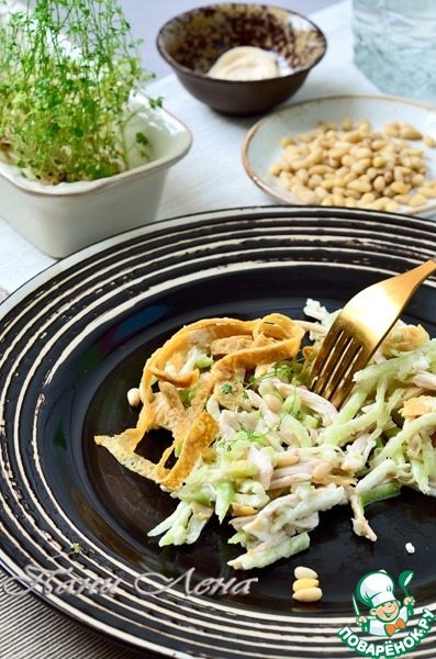 Поливаем салат заправкой, посыпаем подсушенными на сковороде кедровыми орешками.