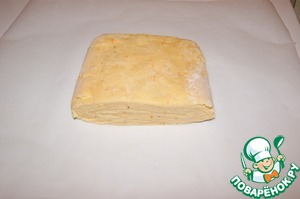 Охлажденное тесто раскатать в пласт 35х45 см и толщиной 1/2 см, сложить так же как и в первый раз и опять поместить в холодильник на 30 минут. Проделать эту операцию еще 2 раза.