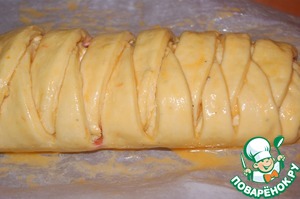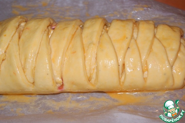 Ножом для нарезки пиццы или любым острым ножом, разрезать тесто по бокам на косые полосы от начинки к краю.