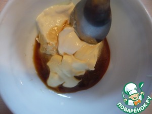 Готовим соус: 2 ст. ложки сметаны,2 столовые ложки майонеза, 1 ст. ложка соевого соуса и сок 1 ч. ложки лимона. Смешиваем.