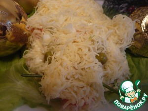 Формируем из салата собачку. Обильно посыпаем тертым на мелкой терке сыром. Глазки у нас горошины, ротик-кусочек морковки.