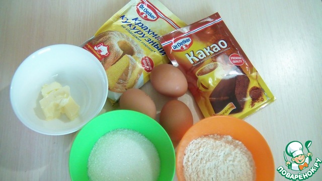 • Смешать сухие ингредиенты: муку, какао от «Dr. Oetker» и кукурузный крахмал от «Dr. Oetker». Отдельно взбить яйца с сахаром до пышной массы.