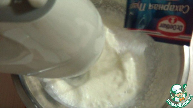 • Для крема охлаждённые сливки взбить с сахарной пудрой от «Dr. Oetker» со вкусом ванили. Очень ароматная пудра! Взбивать до плотных пиков.