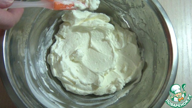 • Добавить творожный сливочный сыр к сливкам, миксером на малых оборотах взбить около минуты.