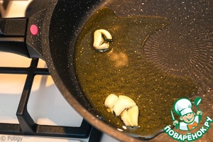 Достаём чеснок. Выкладываем на сковороду грибы и обжариваем до золотистого цвета ( грибы забирают вкус чесночного масла)