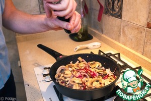 Добавляем тимьян в грибы (по вкусу) и перемешиваем. Доводим до готовности, отправляем грибы с луком и тимьяном в блендер