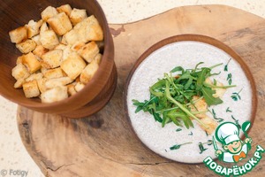 Наливаем суп в тарелку. Украшаем сухариками и небольшой горсточкой рукколы.