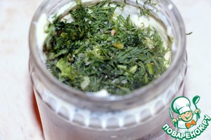 • В оставшийся соус добавить чеснок, укроп, сметану и измельчаем блендером.