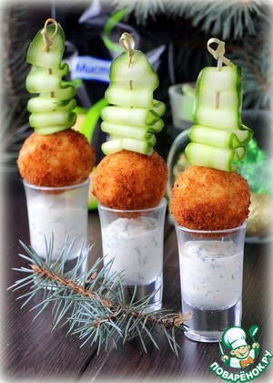 • В рюмки выкладываем острый соус, сверху кладем сочный крокет, украшаем слайсами огурца.
