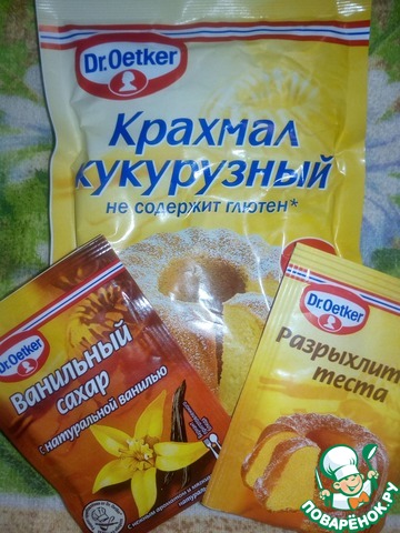 В этом рецепте я использовала высококачественную продукцию известного производителя товаров для выпечки и приготовления десертов "Dr.Oetker": кукурузный крахмал, разрыхлитель теста и ванильный сахар с натуральной ванилью.