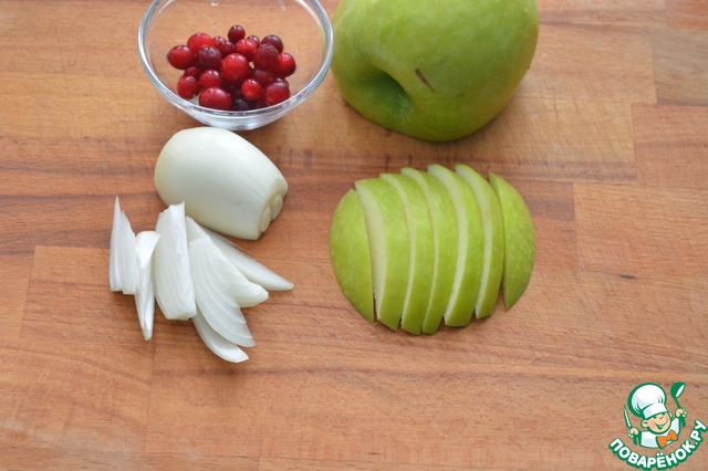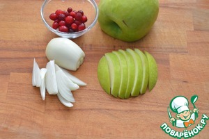 Яблоко и лук нарежьте дольками. Бруснику, если замороженная - разморозьте