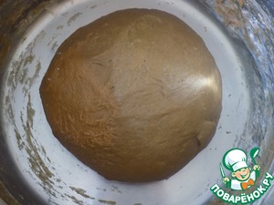 В опару влить кофейную смесь, перемешать и постепенно добавить муку, сначала ту, что с какао, потом остальную. Тесто нужно вымешивать минут 10-15. Если оно липнет к рукам, не торопитесь подсыпать муку, в процессе вымешивания развивается клейковина и липкость уменьшится. Готовое тесто должно получиться мягким, эластичным и не липнущим в рукам. Посуду с тестом накрываем пищевой пленкой (не забываем сделать в ней маленькую дырочку)и ставим в теплое место до увеличения в 2-3 раза.
