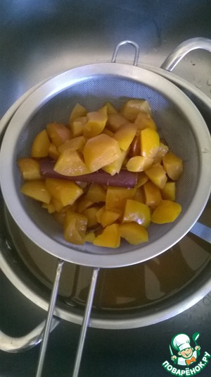 После 4 часов я даю немного остыть и начинаю фасовать. В рецепте американцы, почему то яблоки выбрасывали, но я из России из 70-х, никогда ничего не выбрасываю. Короче - дайте яблокам стечь в посуду. Немного их перемешайте, что бы слить лишний сок. Если готовите с палочками корицы, на этом этапе их вытаскивают. Гвоздику я оставляю.
