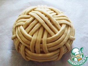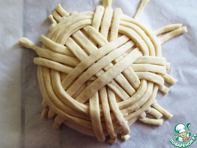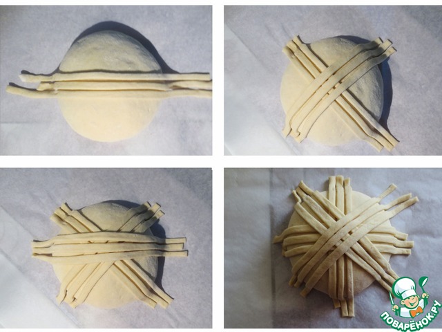 Разделить тесто на 2 неравные части. Из большой части сформировать колобок. Из другой части раскатать пласт, толщиной 2 мм. Разрезать его на полоски, шириной 5 мм. И теперь начинаем украшать поверхность хлеба. Кладем по 3 полоски крест на крест, повторяя 2 раза