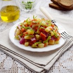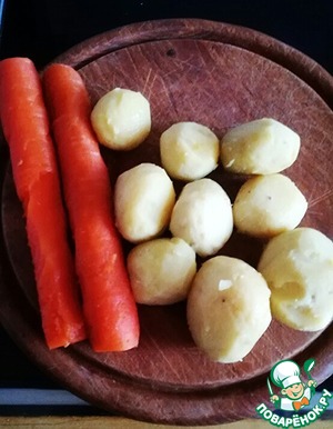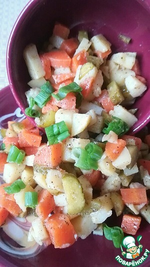 Тут и писать-то, собственно, нечего. Овощи заранее отварить в мундире. Они спокойно могут храниться в холодильнике дня три. Овощи очистить и нарезать кубиками.
