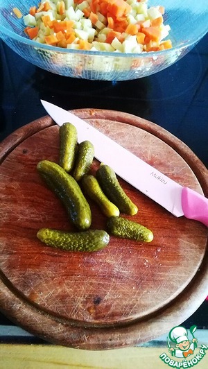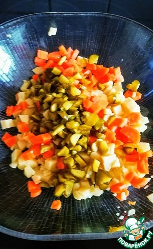 Огурцы вынуть из маринада и тоже нарезать кубиками.