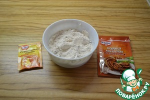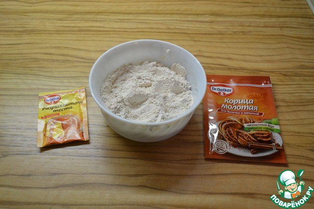 Пшеничную и цельнозерновую муку смешайте с разрыхлителем и корицей.