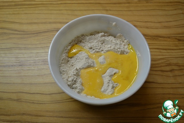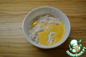 Яйцо взбейте с сахаром. Добавьте к сухой смеси и перемешайте.