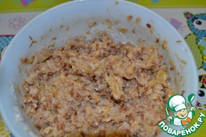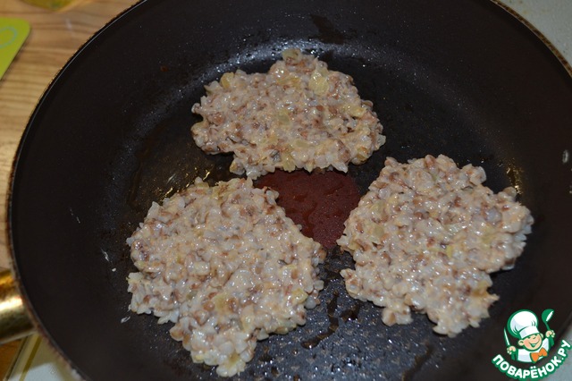 Смешайте сваренную гречневую кашу, взбитые яйца, лук и муку. Дайте постоять 10 минут.