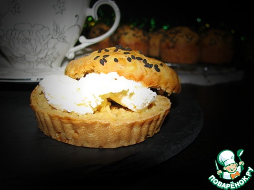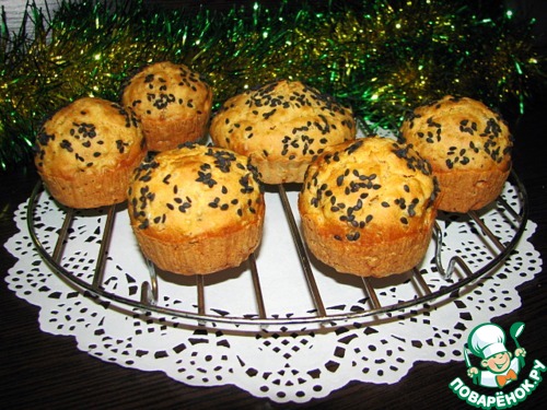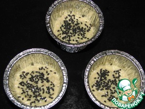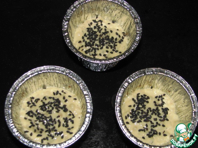 Формочки наполнить тестом на 2/3, посыпать кунжутом, поставить в заранее разогретую до 190 град духовку на 30-35 минут.
