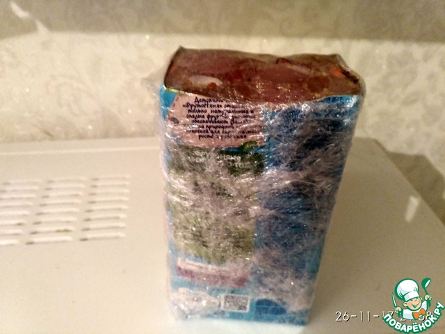 • В пакете из под сока отрезать верх (ту сторону откуда наливают сок). Добавить соль и желатин (в порошке). Быстро и тщательно перемешать. Сложить плотно в пакет из под сока и замотать пищевой плёнкой со всех сторон, следя чтобы не оставалось воздушных пузырьков под плёнкой.