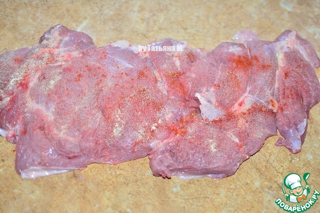Внутреннюю часть пласта подсолить, посыпать чесноком и перцем.