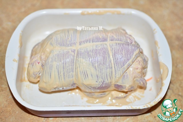 Готовить при 190 градусах до легкой корочки, жар убавить до 100 и доготовить. В процессе пару раз еще смазать рулет сметанной смесью.