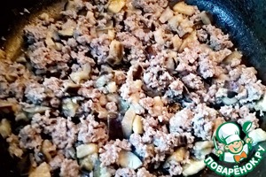 Кубики баклажана и фарш посолить и тушить 10-15 минут