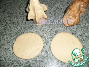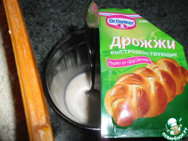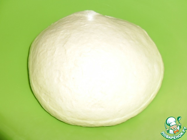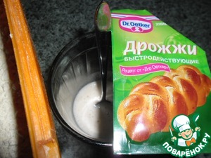 • В теплой воде, с добавлением щепотки сахара, разведем дрожжи. После появления пенной шапочки замесим тесто.