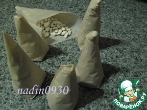 • Тем временем приготовим формы для булочек-елочек. Из пекарской бумаги (пергамента) свернуть кульки, наполнить их фасолью, крепко закрыть донышко, заранее проверьте что бы форма была устойчива.