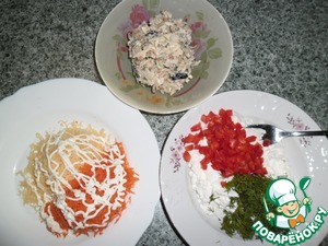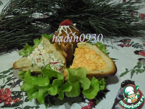 • Берем салаты или паштеты, на ваш вкус. Начиняем булочки. Я взяла 3 варианта начинки 1 - творог+перец болгарский+укроп, 2 - морковь и сыр тертые+чеснок+майонез, 3 - Салат "Символ года" (ссылка на него в конце рецепта)