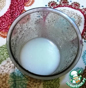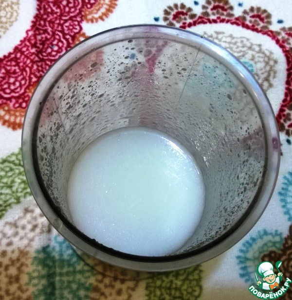 Получится вот такая белая эмульсия, напоминающая молоко. Кладем сахар (я положила 2 столовые ложки, поскольку начинка сладкая, да еще и декор сверху сладкий, а вы смотрите на свой вкус).