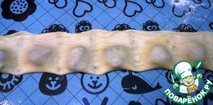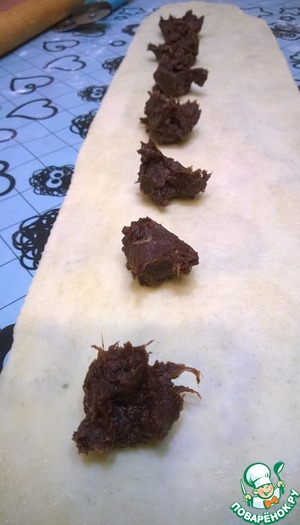 Делим тесто на 2 части. Раскатываем в длинную полосу шириной примерно 15 см. Толщина – около 2 мм. Раскладываем начинку – по чайной ложечке, на некотором расстоянии.