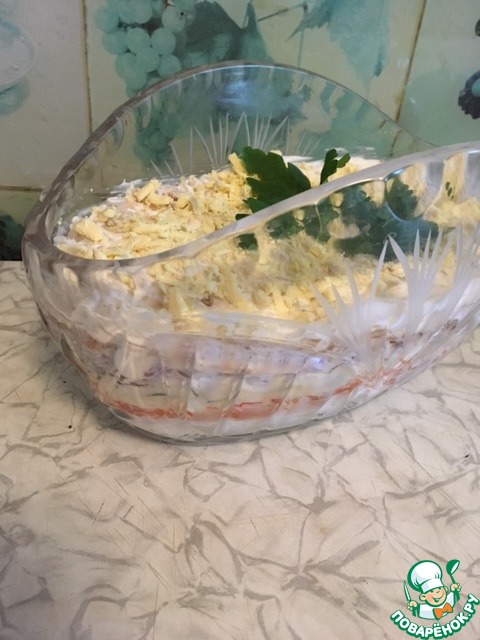 Миску с выложенными слоями салата перевернуть на плоское блюдо, посыпать желтковой соломкой, украсить вырезанными из яиц цветами и веточками петрушки.