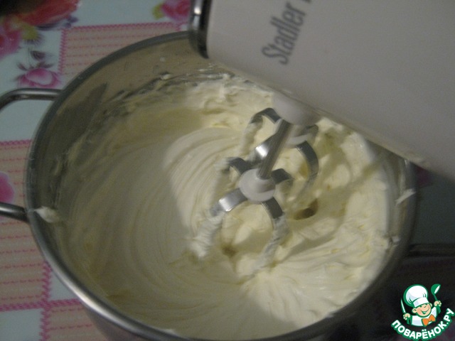 Сначала приготовим крем. Охлаждённые сливки взбить с сахарной пудрой, добавить маскарпоне, еще немного взбить, добавить сгущённое молоко.